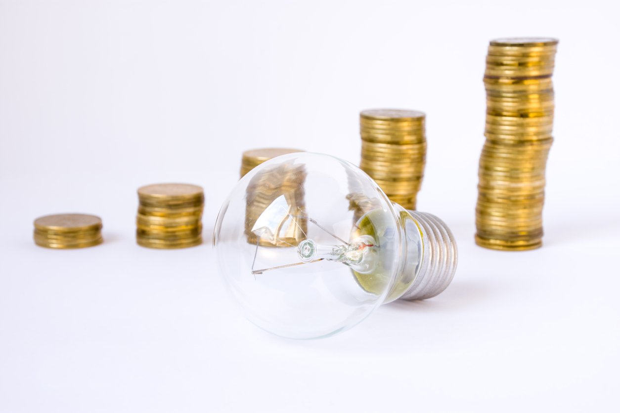 点灯した電球の前に、金貨が段階的に積み重ねられている画像